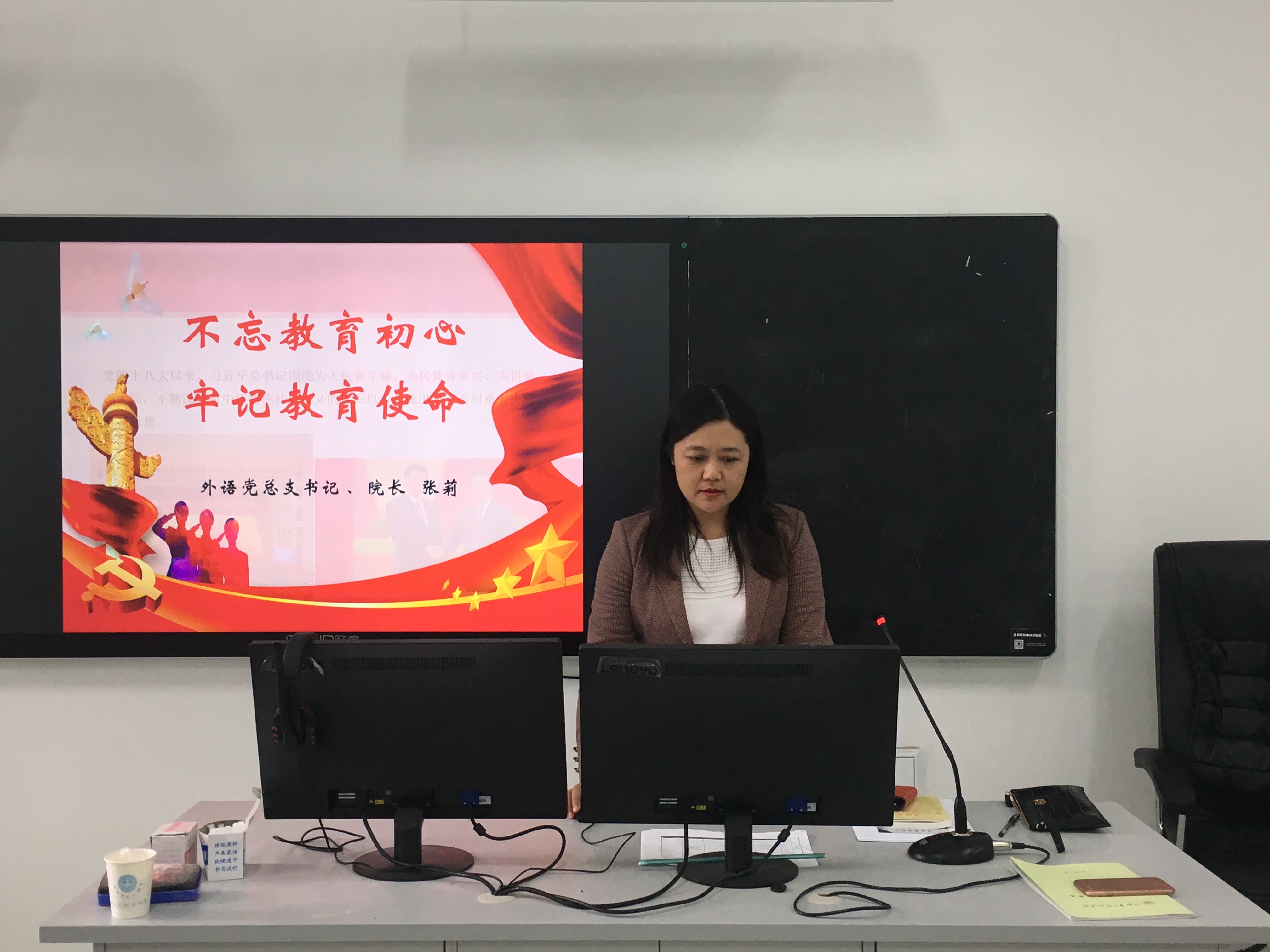 11月6日下午,按照我校 “不忘初心、牢记使命”主题教育统一部署,外国语学院党总支书记、院长张莉为学院全体教职工党员讲授“不忘教育初心、牢记教育使命——加强新时代高校教师队伍建设”主题教育专题党课,党总支副书记余鑫主持党课学习。