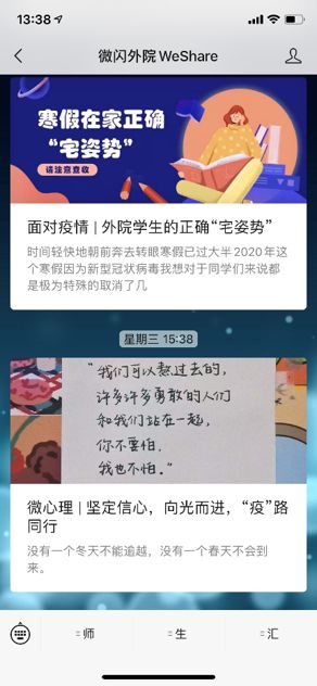 学院积极引导师生正确看待疫情,关注官方媒体的信息通报,不信谣、不传谣,不恐慌。截至2月18日,我院微信公众号“微闪外院We Share”共发宣传文章4篇,分别通过假期如何安排学习生活、学生学习防疫知识、密切关注疫期学生心理健康、疫情期间外院人如何支持防疫工作等内容,展现外院学子在疫情防控期间积极参与防控工作,“停课不停学”的良好精神面貌。