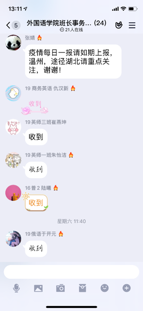 外院按照学校通知要求,密切关注学院师生的健康情况,除了学院所有教职员工每天汇报个人所在地及健康情况外,辅导员每天坚持与全体学生进行沟通,摸排疫情动态,落实好“日报告”制度,做到不漏报、不瞒报、不错报。