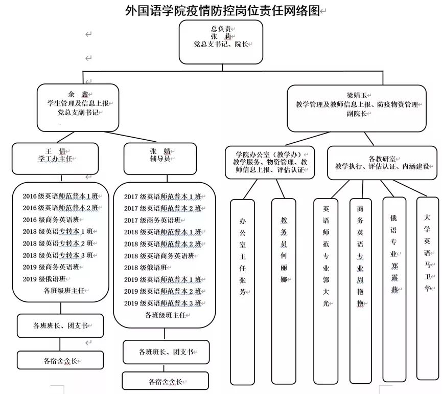 学院高度重视疫情防控工作,成立了以党总支书记、院长张莉同志为组长的疫情防控工作领导小组,工作组由班子成员、党支部书记、科级干部、专业(大学外语)负责人组成,并详细制定了《外国语学院疫情防控工作方案》进行了具体分工,密切关注疫情发展变化,部署落实学校要求,指导学院开展疫情防控工作。
