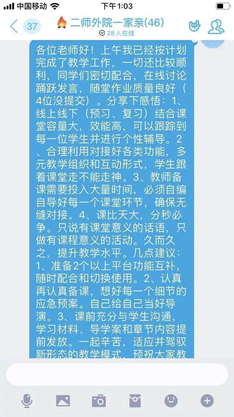 第三阶段是正式授课阶段。为保证课堂的顺利进行,学院教师多次请家人或学生提前熟悉各个平台的各项功能,并根据尝试效果,不断调整授课环节中互动、讨论的形式。为避免上课高峰期网络不畅,教师或组建QQ群、或通知学生安装钉钉等软件,在授课过程中可根据网络情况和授课需要随时切换,为正式课堂教学做了充分准备。
