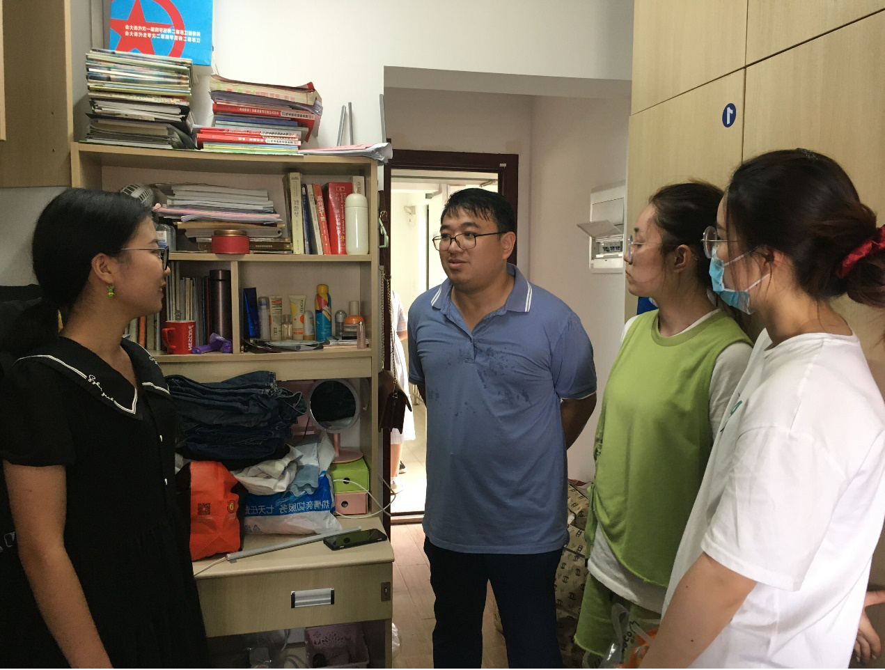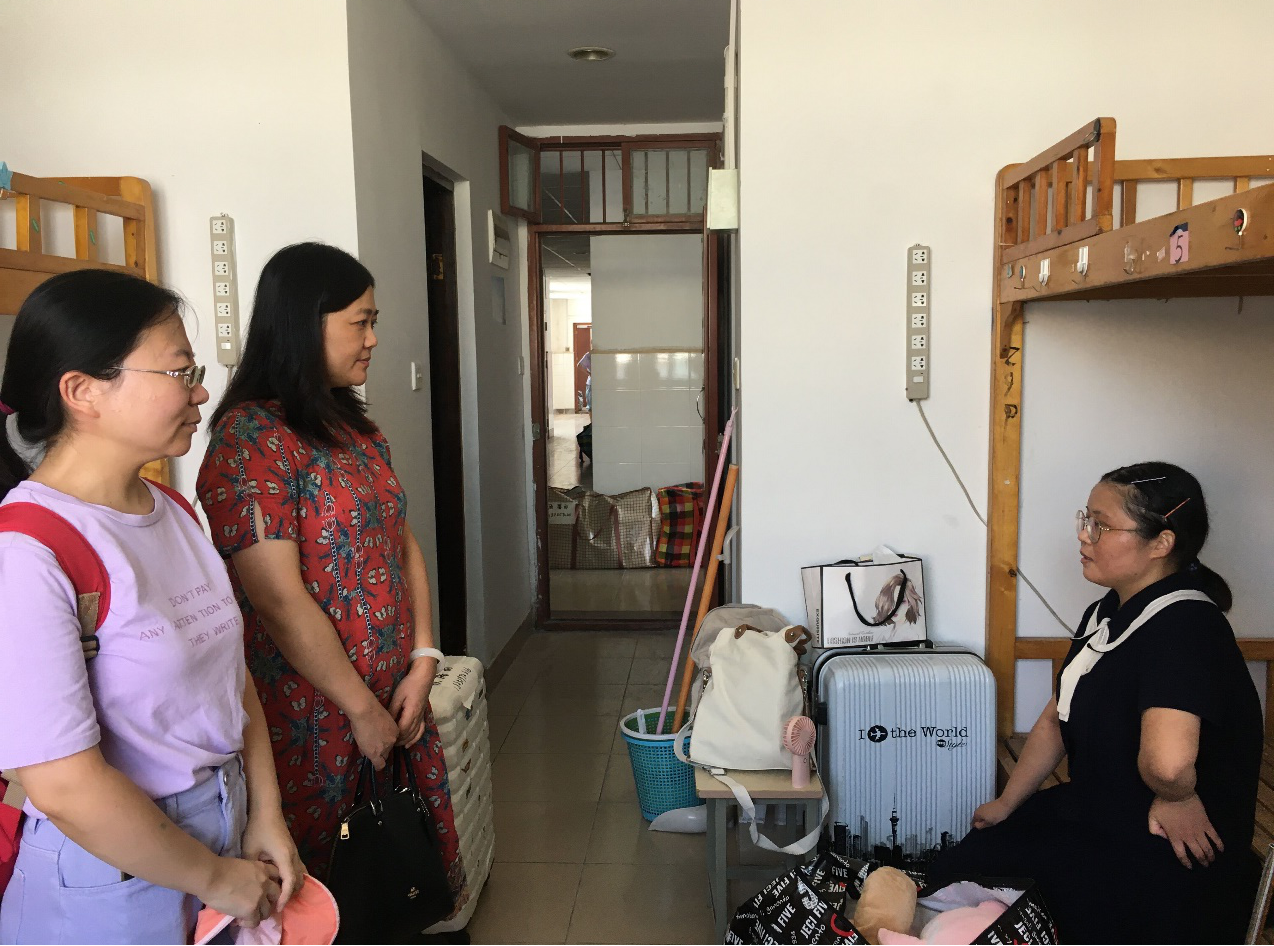 9月5日,院党总支副书记余鑫带领学工办主任王倩以及辅导员老师第一时间深入学生宿舍,了解学生返校的动态情况和生活需求。