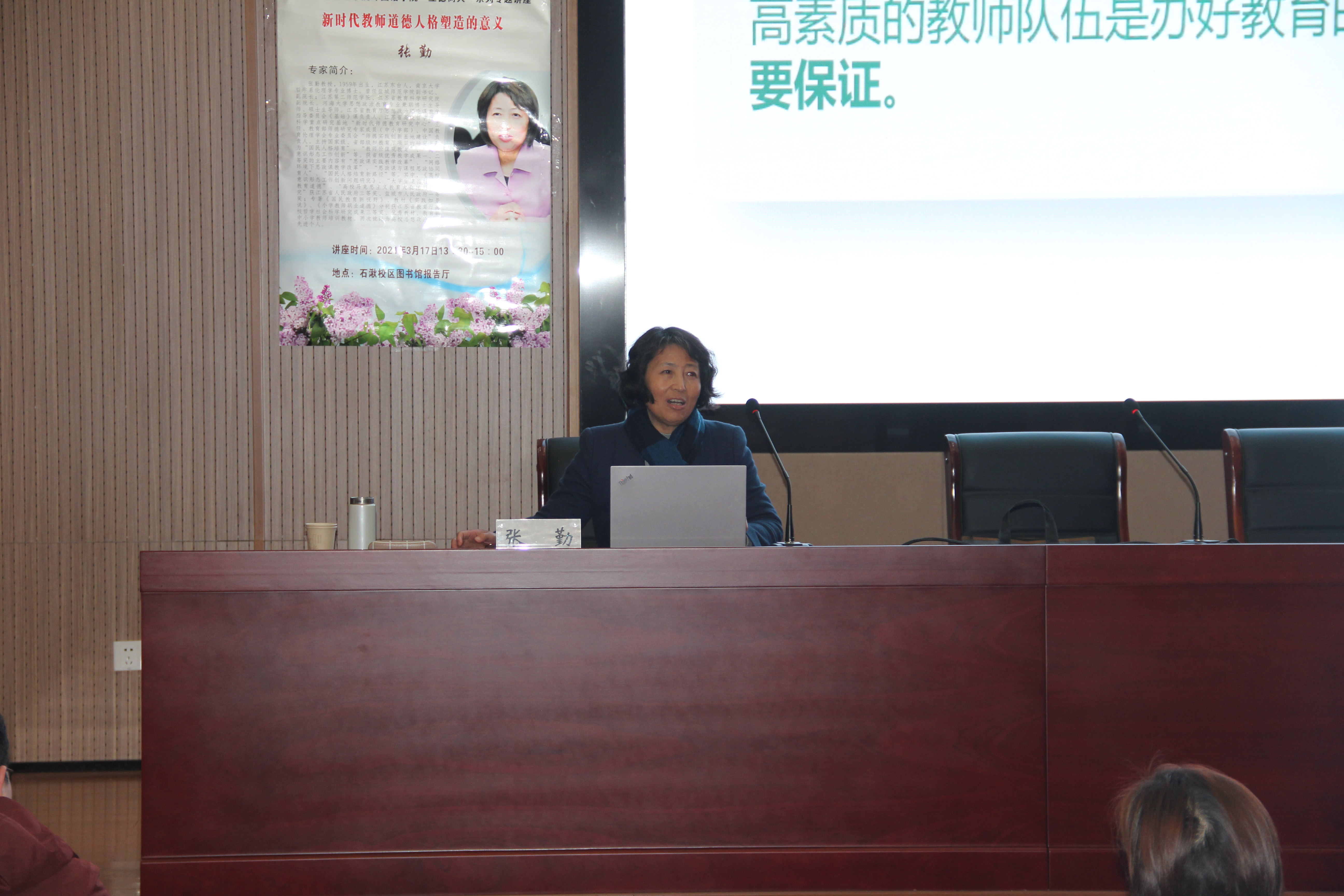 3月17日下午,我院特邀江苏省高校哲学社会科学重点研究基地“新时代师德教育研究中心”主任、中国教育伦理学会专业委员会“师德实践创新基地建设”负责人张勤教授,在石湫校区图书馆报告厅开设主题为新时代教师道德人格塑造的专题讲座。讲座由院长、总支书记张莉主持,学院全体教职工及师范生参加学习。
