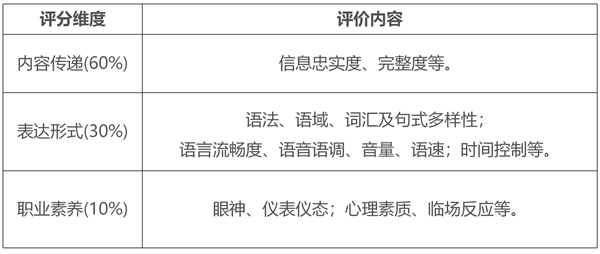 4.口译比赛:口译赛题涵盖习近平新时代中国特色社会主义思想核心内容,涉及经济建设、政治建设、文化建设、社会建设和生态文明建设等领域的重要话题,考查形式包括视译、交替传译(主旨口译、会议口译、对话口译)等形式。评分维度和评价内容详见表1。