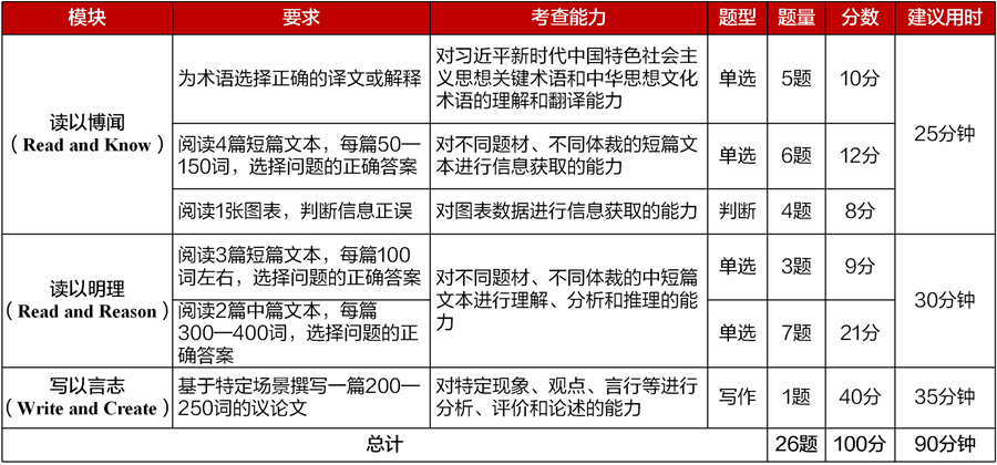 1.综合能力赛项:全国统一线上校赛赛题由大赛组委会提供,包括客观题若干道和议论文写作1篇,赛题构成见表1。