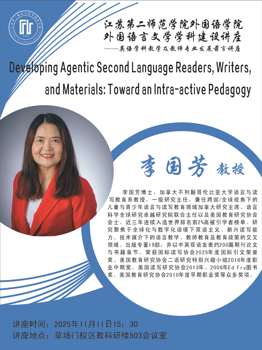 11月11日下午,我院在草场门校区教科研楼503教室举办了英语学科教学前沿专家讲座,讲座主题为:Developing Agentic Second Language Readers, Writers, and Materials: Toward an Intra-active Pedagogy。讲座专家为加拿大不列颠哥伦比亚大学语言与读写教育系李国芳教授。英语学科教学创新团队和外语教育学学科背景教师以及全体教育硕士参与讲座。讲座由院长张莉主持。
