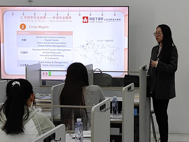 随后,她列举了国外名牌大学的热门专业,通过分享自己的留学经历对学生的院校选择做出深层次的指导,她告诉同学们,选择标准应该以院校排名——QS World Ranking为先,再考虑专业排名,同时从兴趣爱好、就业导向、实践机会、城市环境等角度出发,综合考虑。