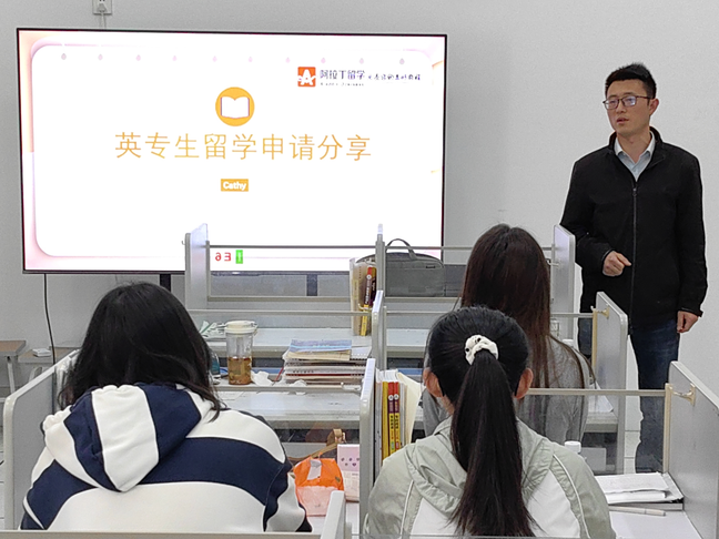 为推进学院的国际化人才培养工作,应对英语专业学生的升学问题,4月24日下午,我院英专生留学分享会顺利开展。本次分享会由我院学生党支部书记王超主持,“阿拉丁留学”留学部门主管陈祎珺主讲,我院部分学生参加。