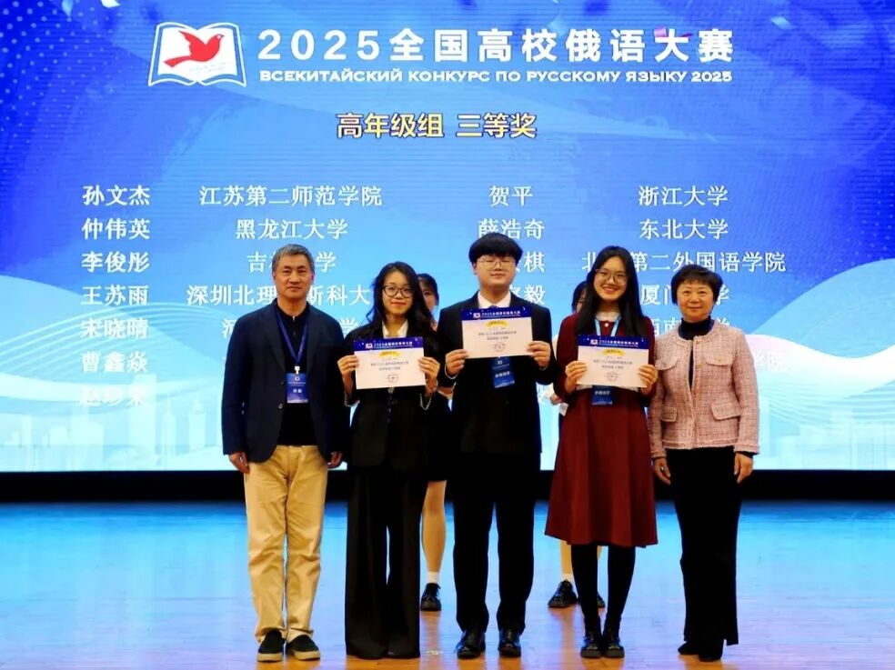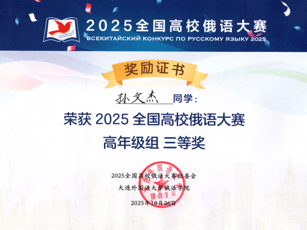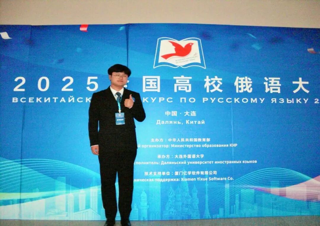 2025年10月25至26日,由教育部国际合作与交流司主办、大连外国语大学承办的2025全国高校俄语大赛落下帷幕。我院2022级俄语普本班孙文杰同学荣获高年级组三等奖(全国第九名,三等奖排名第一),再创历史最佳成绩,并获国家留学基金委全额资助赴俄罗斯攻读研究生资格。